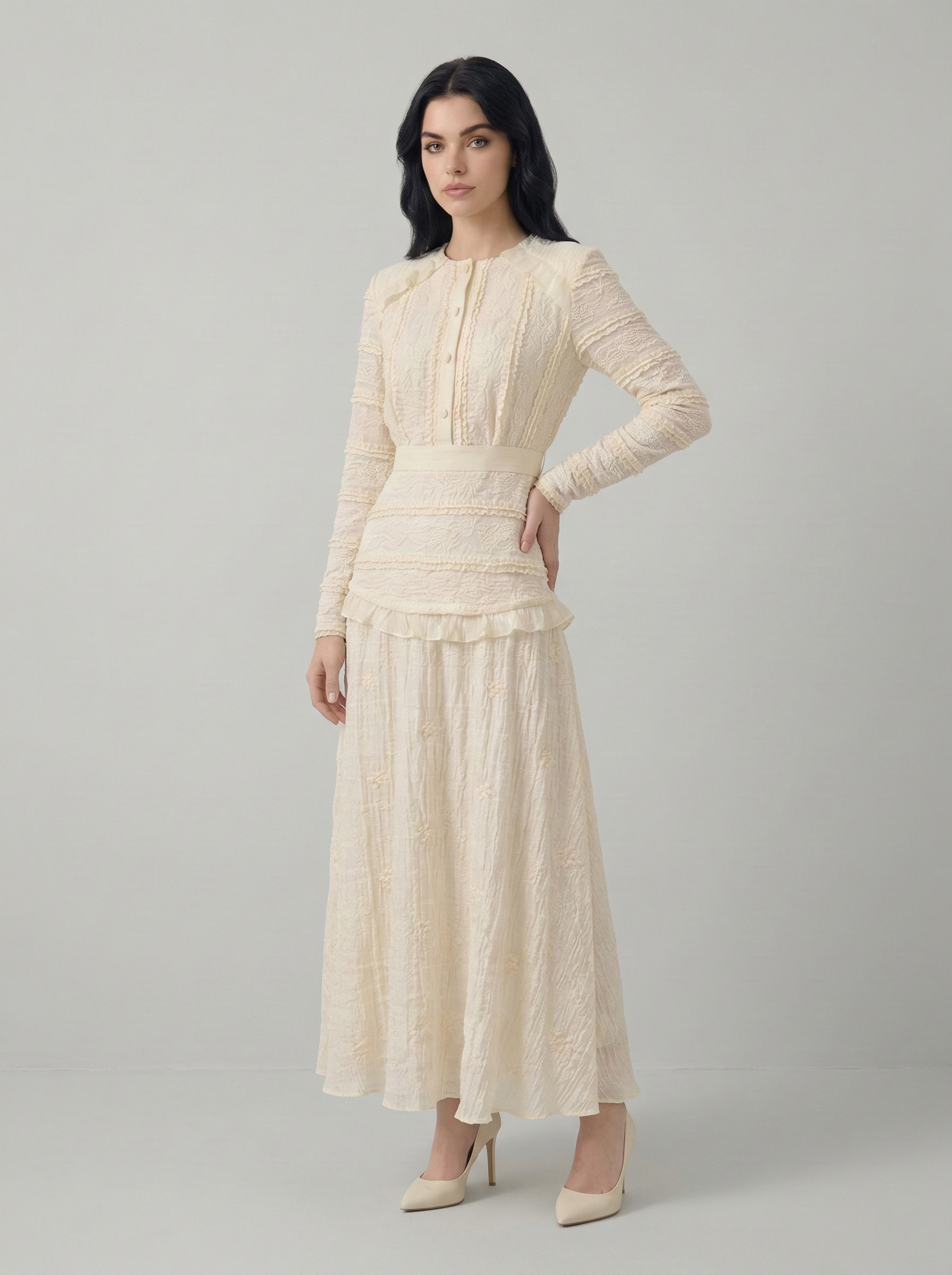 Kadın Düğme Detaylı Fırfırlı Uzun Elbise